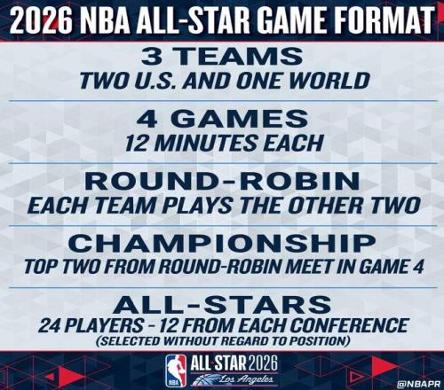 2026年NBA全明星赛正式改革,采用全新“美国队VS世界队”赛制。2026年NBA全明星正赛,两支由美国球员组成的球队是美国队,外加一支由国际球员组成的球队是世界队,将采用循环赛制进行竞争,共包括四场12分钟的比赛,这三支球队每队至少有八名球员。